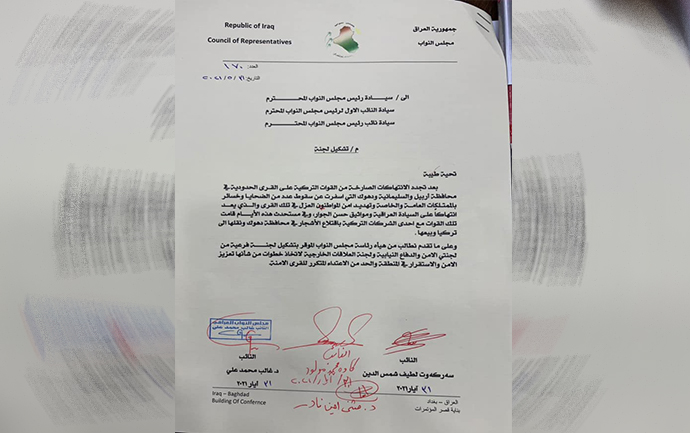 Li dijî êrîşên dewleta tirk 4 parlamenterên kurd ên endamên Parlamentoya Iraqê; Serkewt Şemsedîn, Xalib Mihemed, Mawe Mihemed, Musena Emîn daxwaznameyek amade kirin û daxwaznameyê radestî serokatiya parlamentoya Iraqê kirin.