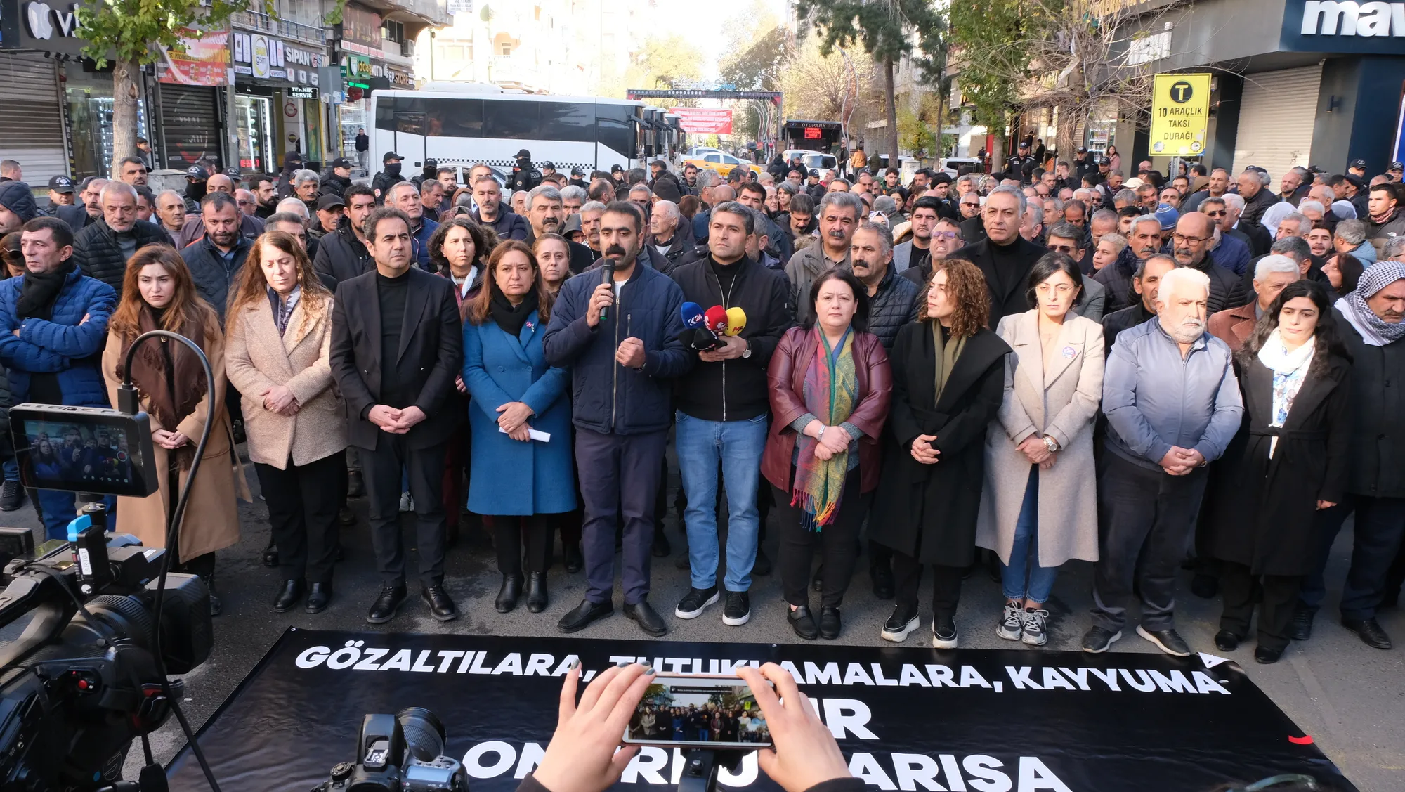 Rêxistina DEM Partiyê ya Amedê li dijî operasyonên binçavkirinê, girtin û tayînkirina qeyûman li pêşiya AZC Plaza ya li Semta Ofîsê ya Amedê daxuyanî da. Hevşaredarên bajarê mezin û yên navçeyan, Parlamentera DEM Partiyê Adalet Kaya, nûnerên rêxistinên civaka sivîl û gelek welatî amade bûn. Girseyê pankarta “Ji binçavkirin, girtin û qeyûman re na, ji aştiyeke birûmet re erê” hilgirtin. Polîsan bi wesayîtên zirxî rê li trafîkê girtin. Li dijî vê zextê beşdaran bi dirûşma “Li dijî faşîzmê mil bidin milê hev” bertek nîşan dan.