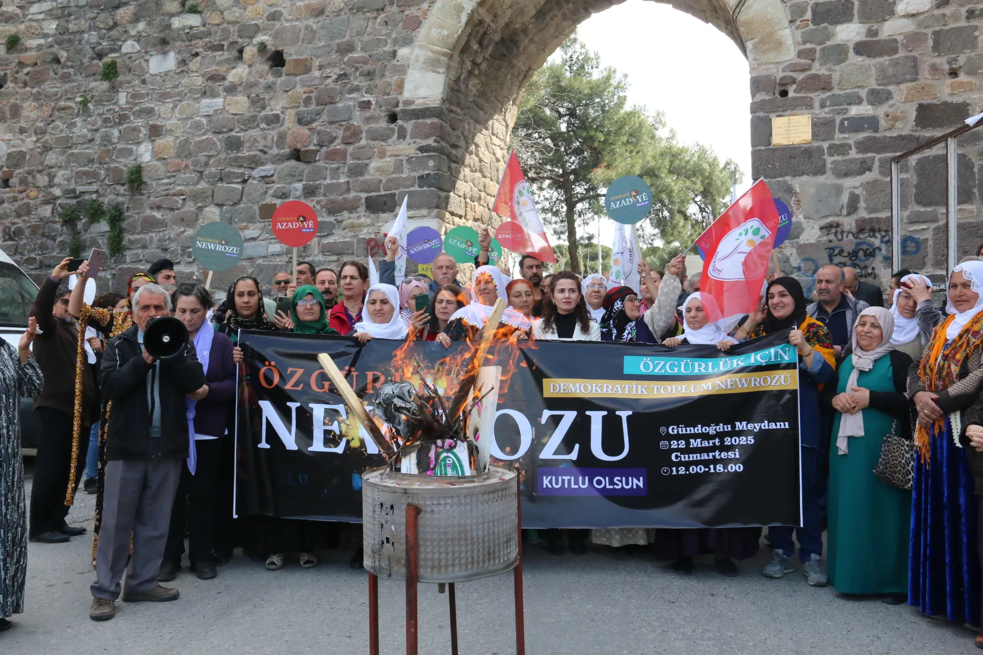 Bi pêşengiya Tevgera Jinên Azad (TJA) û Meclisa Jinan a Partiya Wekhevî û Demokrasiyê ya Gelan (DEM Partî) a Îzmîrê, bi dirûşma “Em li dijî qirkirina jinê serî hildidin, ber bi azadiyê ve dimeşin” daxuyaniyeke çapemeniyê hat dayîn û li Îzmîrê starta pîrozbahiyên Newrozê hate dayîn. Daxuyaniya ku dihat xwestin li Kadîfekaleyê bê dayîn, ji ber astengiya polîsan li ber kelehê hat dayîn. Di daxuyaniyê de pankarta “Newroza Azadiyê pîroz be” hat hilgirtin. Girseyê bê navber dirûşmên "Ji şer re na, aştî a niha”, "Newroz pîroz be" û "Şehîd namirin" berz kir.