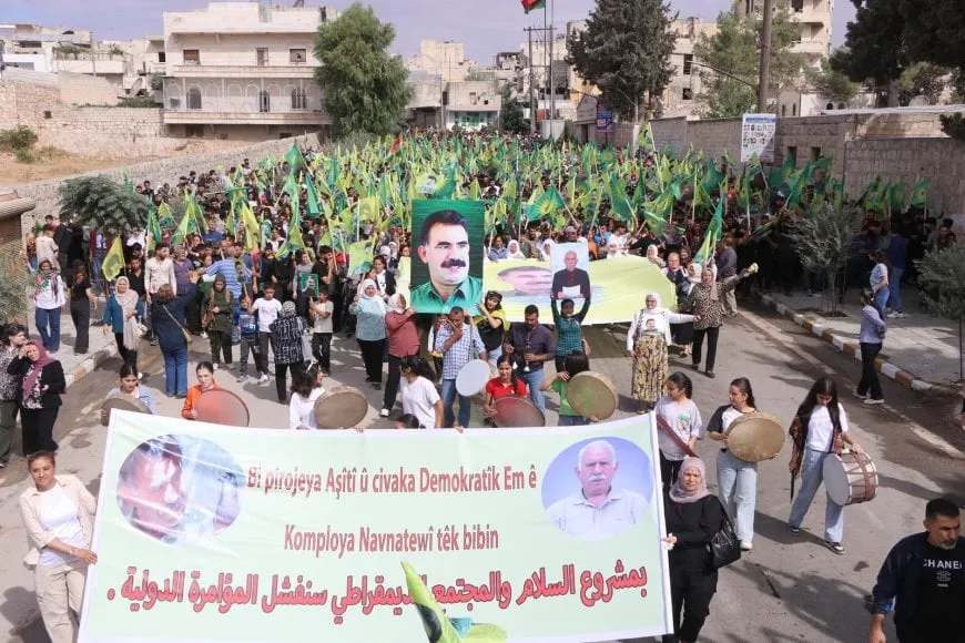 Bi dirûşma "Bi Projeya Aştî û Civaka Demokratîk, Em ê Komploya Navneteweyî Têk Bibin", Meclisa Malbatên Şehîdan û Partiya Yekitiya Demokratîk (PYD) ji bo şermezarkirina Komploya Navdewletî ya li dijî Rêberê Gelê Kurd Abdullah Ocalan meşek li dar xistin.