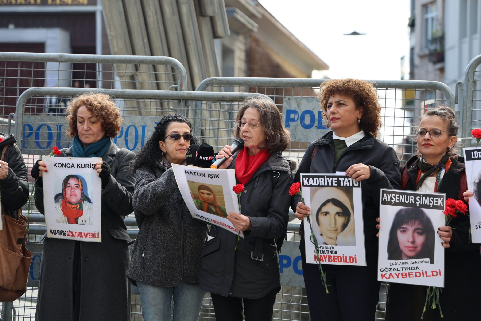 Oya Ersoy diyar kir ku sibe 8ê Adarê ye û got: “8ê Adarê tê wateya têkoşînan jinan ya wekhevî û azadî û edaletê. Ji bo me jî heman demê roja bîranîna jinên di binçav de hatine windakirin e. Li gorî daneyên me li Tirkiyeyê 19 jin û zarokekê 3 salî di binçav de hatiye windakirin. Ji wan jinan tenê 4 jinê ku piştî îşkenceyê hatine veşartin hate dîtin. Aqûbeta kesên din nayê zanîn. Em bi salan e dibêjin; polîtîkayên bêcezahiştinê ya dewletê tundiyê li ser civakê jî zêde dike. Li piştî kuştin û tundiya li ser jinê jî ev hişmendî heye. Em di 8ê Adarê de ne tenê jinên îro, jinên bi zorê di nav me de hatine derxistin jî bibîr tînin. Em dizanin ku bîr nayê bêdengkirin.”