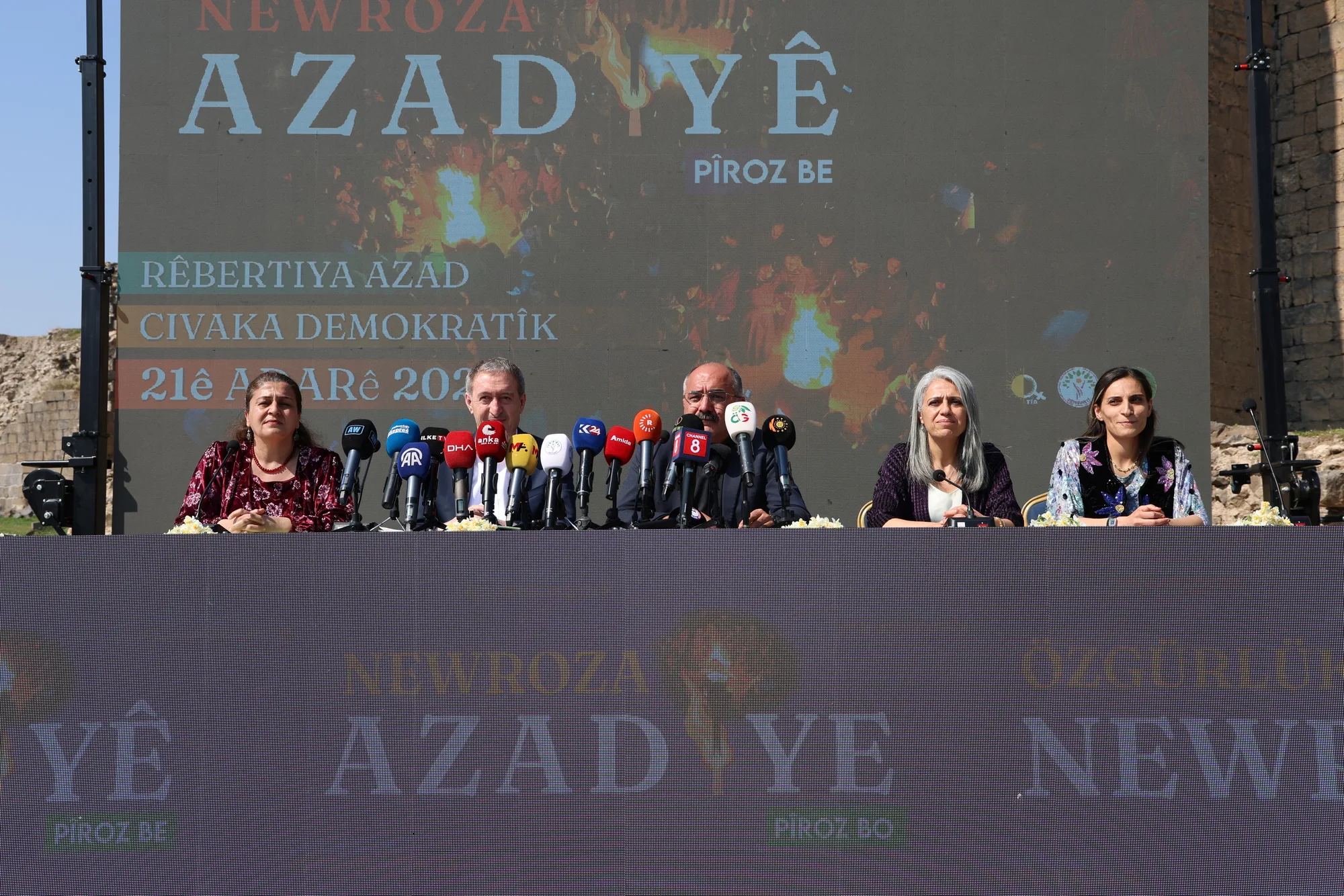 Bi beşdariya Hevserokê Giştî yê DEM Partiyê Tuncer Bakirhan, Hevserokên Giştî yên DBPê Keskîn Bayindir û Çîgdem Kiliçgun Uçar, Hevserokê Kongreya Civaka Demokratîk (KCD) Berdan Ozturk, aktîvîstên TJAyê, parlamenterên DEM Partiyê Mehmet Kamaç û Sînan Çîftyurek li ber sûrên Amedê li Deriyê Mêrdînê deklarasyona Newroza 2025an hat eşkerekirin.