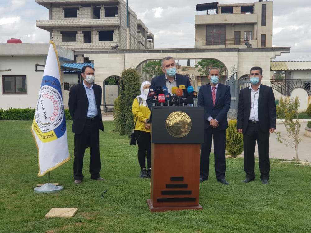 Hevserokê Desteya Tenduristiyê ya Rêveberiya Xweser a Bakur û Rojhilatê Sûriyeyê Dr. Ciwan Mistefa îro li Qamişloyê têkildarî rewşa dawî ya vîrûsa koronayê daxuyanî da çapemeniyê.