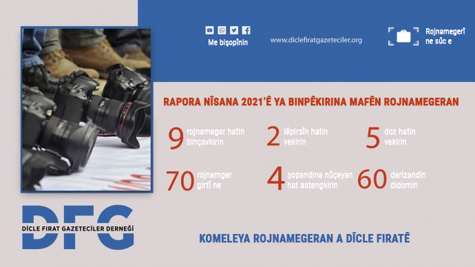 Komeleya Rojnamegeran a Dîcle Firatê ku her meh têkildarî neheqiyên li rojnamegeran û mejarên din ên têkildarî çapemeniyê dinirxîne, rapora xwe ya nirxandina meha nîsanê weşand. Li gorî raporê di meha nîsanê de, 9 rojnameger hatin binçavkirin û li 5 rojnamegeran jî doz hat vekirin.