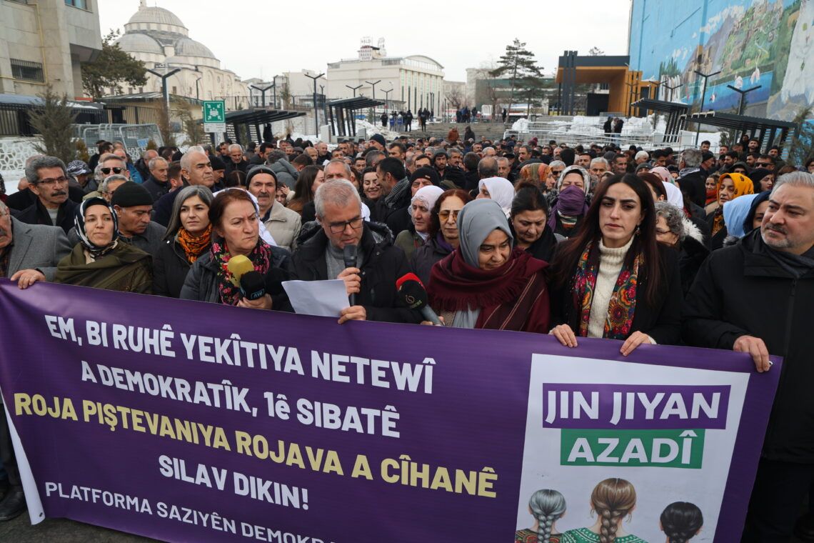 Piştre parlamentera DEM Partiyê Gulderen Varli axivî û bal kişand ser parastina Rojava. Gulderen Varli destnîşan kir ku divê cîhan û Tirkiye dest ji piştgiriya hişmendiya DAIŞê berdin û got: “Em weke gelê kurd li çar parçeyan bûne yek û me got ‘Yek e Yek e Yek e gelê kurd yek e’. Em dê li hemberî hemû jenosîdan weke gelê kurd rawestin û qebûl nakin. Em weke jin, ciwan û zarokan li hemû qadan li gel têkoşîna gelê xwe yê Rojava ne. Heta ku hûn digehijin statûya xwe em ê li gel we bin û tu carî jî paş ve gav naavêjin. Heta ku aramiya wir neyê tesîskirin em ê li her derê dirûşmên ‘Rojava rûmeta me ye’ û ‘Bijî berxwedana Rojava’ berz bikin.”