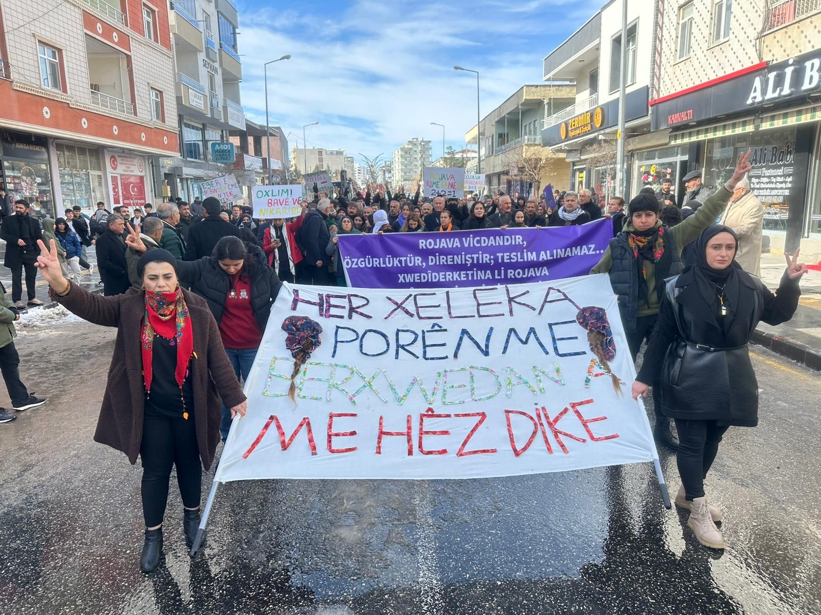 Platforma Saziyên Demokratîk têkildarî êrişên li dijî Rojava li navçeya Kerboran a Mêrdînê meşek li dar xist. Parlamenterên DEM Partiyê, hevşaredar, endam û rêveberên partiyên siyasî û saziyên sivîl ên civakî di nav de gelek kes tev li meşê bûn. Girseya ku li ber avahiya rêxistina DEM Partiyê ya Kerboranê kom bû pankartên li ser ‘Bila êrişan rawestînin, Rojava hêvî ye, berxwedan e, azadî ye. Xwedîderketina li Rojava Xwedîderketina li Mirovahiyê ye’ û ‘Her xeleka porên me berxwedana me bihêz dike’ dinivîsî û kezî li ser hilgirtin û dowîzên ‘Jin jiyan azadî’ , ‘Bimre Koledar Bijî Kurdistan’ , ‘Keziyên me tirsa we ye’ , ‘Heke em nebin yek em ê herin yek bi yek’ , ‘Berxwedan jiyan e’ , ‘Rojava rûmeta me ye’ û ‘Kobanê neket wê nekeve” rakirin. Girseya ku dirûşmên ‘Bijî berxwedana Rojava’ , ‘Jin jiyan Azadî,’ Rojava rûmeta me ye” berz kir, bi fîrfîrokan jî deng derxist. Girseya ku ji Cadeya Mîdyadê dest bi meşê kir bi berzkirina dirûşm û sirûdan heta Qada Miradê Kinê meşiya.