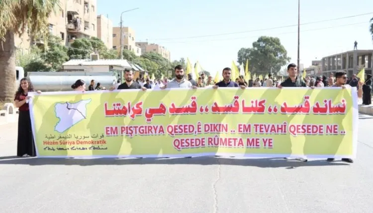 Gelê kantona Tebqayê, koçberên Efrîn û Şehbayê bi armanca piştgiriya Hêzên Sûriyeya Demokratîk (HSD) meşeke girseyî li dar xist.