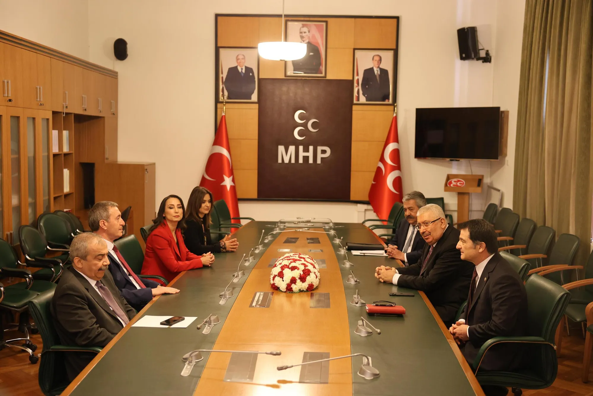Şande, di saeta hevdîtinê de çû Koma Meclisê ya MHPê. Şandeya DEM Partiyê ji hêla cîgirê serokê MHPê Semîh Yalçin, cîgirê serokê giştî yê ji Hiqûq û Karûbarên Hilbijartinê Berpirsyar Fetî Yildiz û cîgirê serokê giştî Îsmaîl Faruk Aksu ve hat pêşwazîkirin.