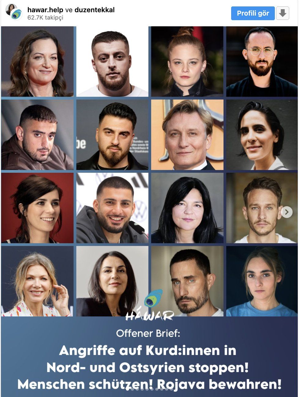 Komeleya Gelên di Bin Xeteriyê de ye û civaka kurd li Elmanyayê li dijî êrîş û dorpêça çeteyên HTŞ, DAIŞ, SMO û Tirkiyeyê li ser Rojava nameyek ji Yekîtiya Ewropa (YE) û Hikûmeta Federal a Elmanyayê re şand. Lîstikvanê Futbolê Denîz Undav û kesên weke Natalia Worner, Aykut Anhan, Ursula Karven, Huseyin Kokseçen, Clemens Schick, Tahsim Durgun, Nora Tschirner, Igor Levit, Jasna Fritzi Bauerve, Jasmin Tabata û gelek kesên navdar tevlî banga komeleyê bûn.