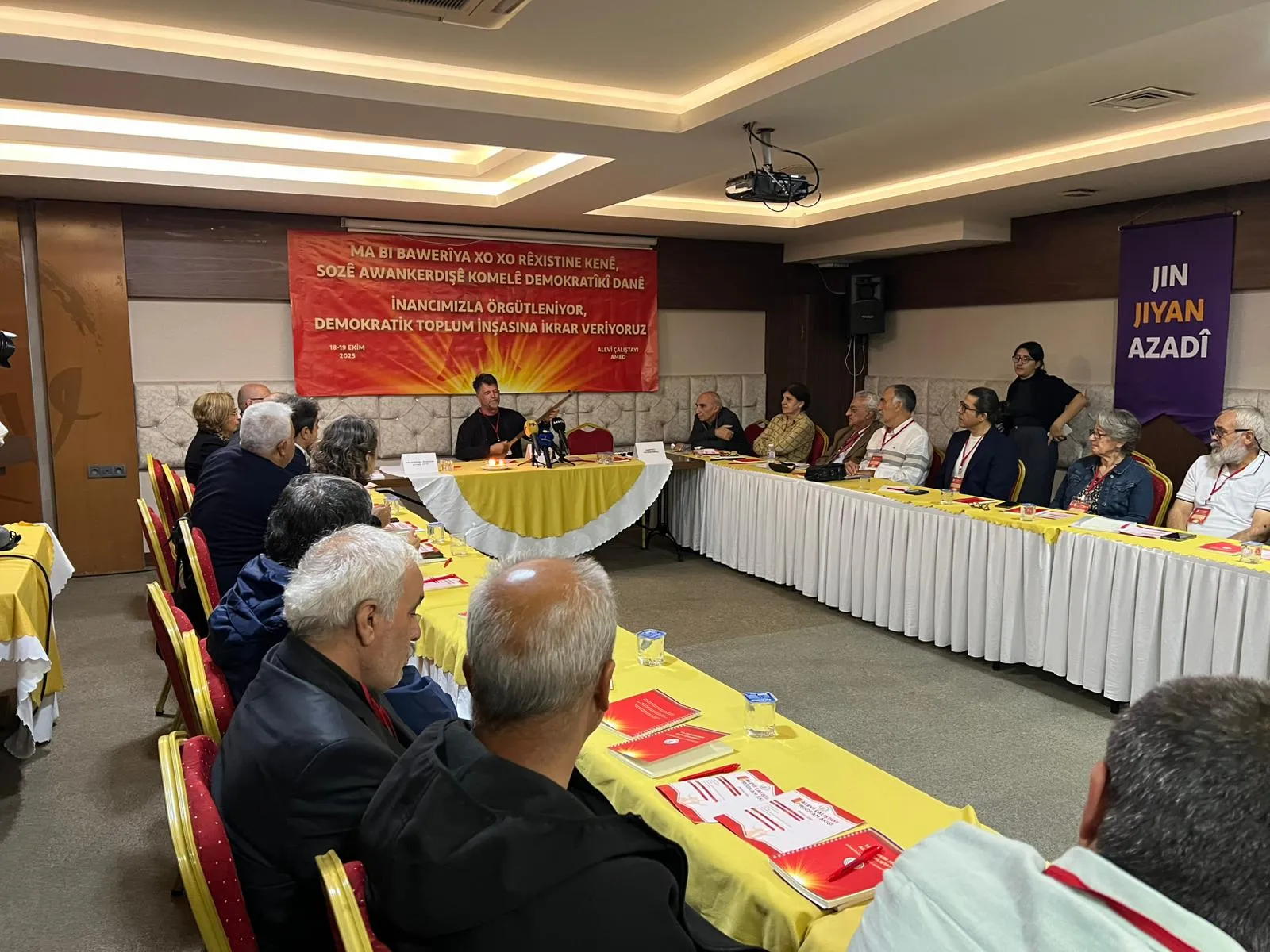 Komeleyên Elewiyên Demokratîk (DAD) bi rojeva pirsgirêkên ku elewî pê re rûbirû dimînin û rola elewiyan a di pêvajoya Aştî û Civaka Demokratîk de çi ye li oteleke li Amedê Komxebata Elewiyan li...