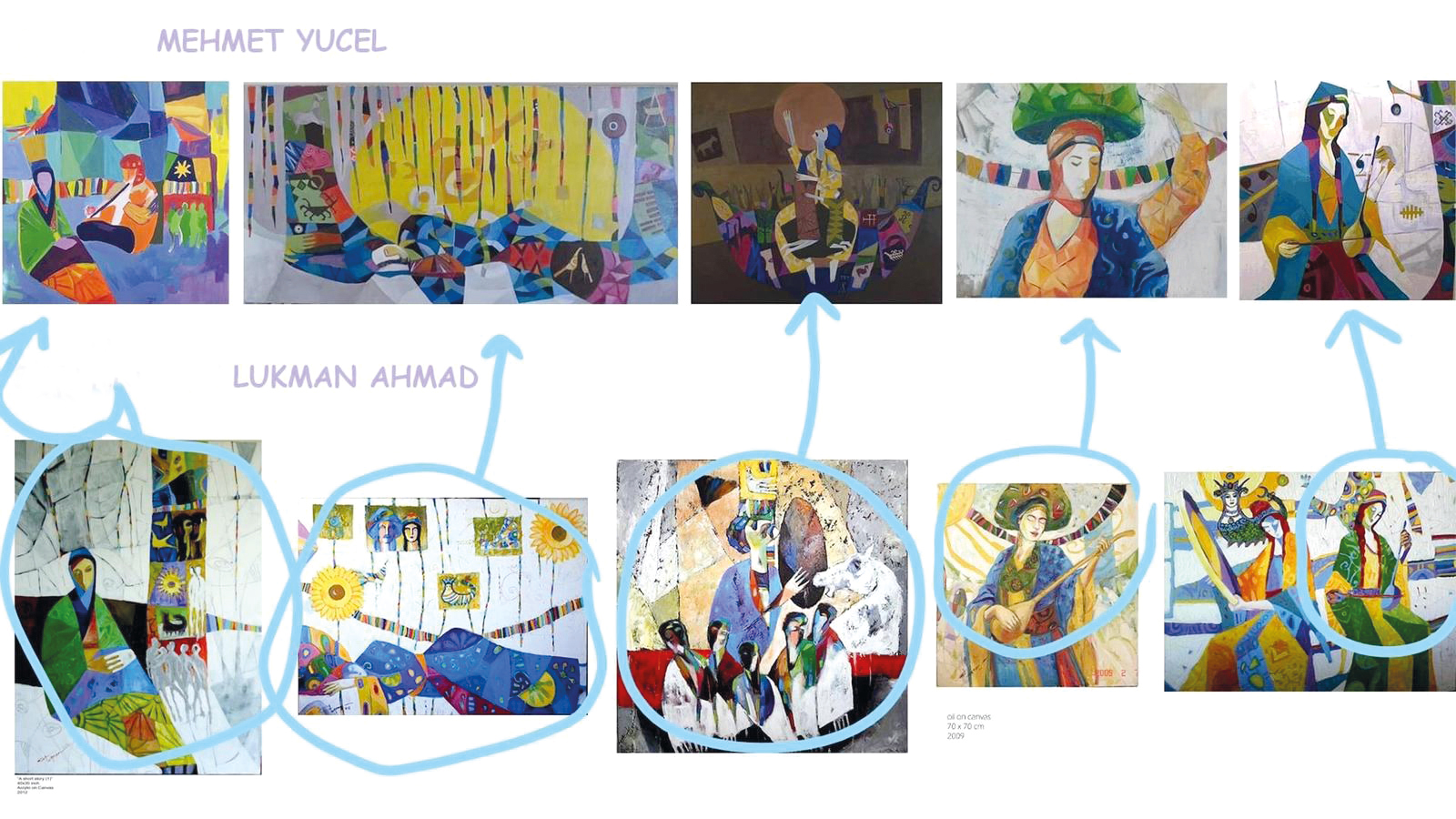 Mehmet Yucel gazincên xwe wiha bi lêv dike: “Ez Luqman Ehmed nas nakim, tenê beriya 15-20 rojan min ew bi tesadufî nas kir, dema min dît ku min li ser malpera civakî dişopîne. Heta piştî ku min tabloyên wî dîtin min ji rengê wî hez kir. Ji ber koleksiyona min heye, min xwest tabloyekî wî bikirim lê wî bersiv neda min. Dibe ji min fêm nekiribe, ji ber min bi tirkî jê re nivîsandibû. Ji 10’ê tîrmehê şûn de gelek name û çêr ji min re hatin. Piştî wê ev mesele li ser tevna civakî hate parvekirin û çêr û sixêf li min hatin kirin û hê jî berdewam dikin. Heke idiayeke mirov hebe bi vî rengî nabe, xwezî berê ez naskiribûma, wê gavê wê zanîbûya ku ez deng û vedenga dîrok û rabirdûya xwe me. Hunermendî ne wiha ye û tew ku mirov ji heman miletî be nabe bi vî rengî bi çêr û heqaretan mirov nêzî hev bibe. Hemû not û reşnivîsên xebatên min li ba min hene. Her wiha di resimên min de ez kompozisyoneke cuda bi kar tînim; ez mijarên xwe bi şêweyê li ser dirêjahiyê û li ser firehiyê an jî panbûnê bi kar tînim. Ew wêneyên ku Luqman wekî mînak nîşan dane navê wan û çîroka wan heye. Ez motîfên ku di tejikan de, di cil û bergên herêmî de, deqên li rû û laşê mirovan ên vê herêmê baş nas dikim û agahiyên min der barê wan motîfan û dîroka wan de jî heye. Wekî mînak resmê min ê Gemiya Nûh û tava ku li paş wê hatiye bikaranîn çawa Luqman dibêje ev û ya min yek in. Jixwe her miletek sembolên wî hene, gelek kes dikarin heman sembolan bi kar bînin.”