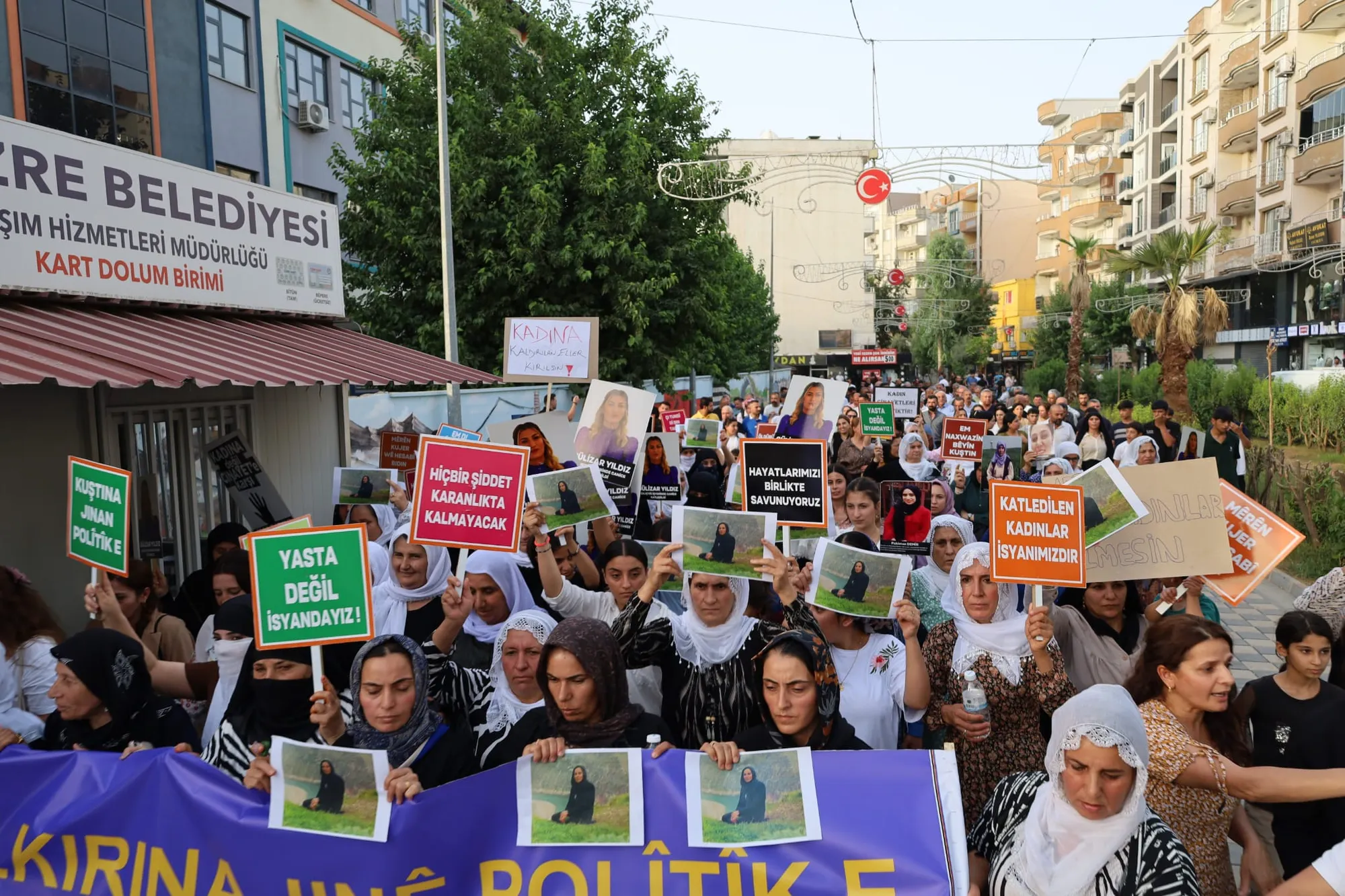Tevgera Jinên Azad (TJA), Partiya Herêmên Demokratîk (DBP) û Partiya Wekhevî û Demokrasiyê ya Gelan (DEM Partî), Dayikên Astiyê, Baroya Şirnexê, Malbata Sabahat Atabey a di van demên dawî de hat qetilkirin, saziyên sivîl ên Şirnexê û gelek kesan li dijî qetilkirina jinan li Kolana Hunerê ya navçeya Cizîrê ya Şirnexê meşiyan. Girse li Kolana Hunerê kom bûn û li wir heta Medresa Sor meşiyan. Di meşe de pankarta "Kuştina jinan polîtîk e", wêneyê jinên di demên dawî de li Şirnexê hatibûn qetilkirin û dovîzên "Jinên hatine qetilkirin raperîna me ne", "Em ne di şînê de ne em serhildanê de ne". Girseyê bênavber dirûşmeyên, "Jin jiyan azadî", "Destên dirêjî jinê dibin bila bişkên" û "Kuştina jinan polîtîk e" berz kirin.