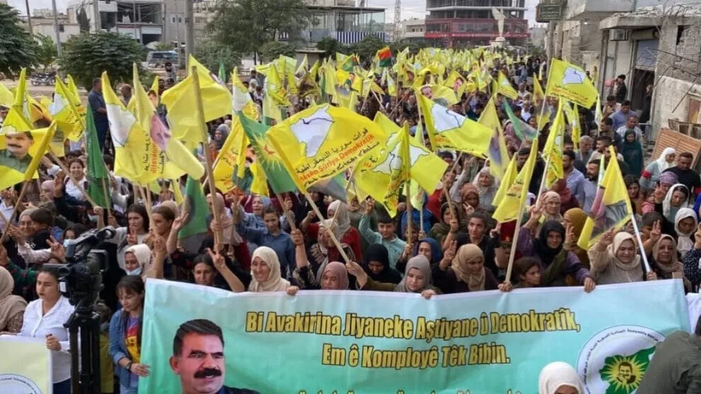 Bi hezaran şêniyên kantona Firatê bi meşeke girseyî Komploya Navneteweyî ya 9ê Cotmehê ya li dijî Rêberê Gelê Kurd Abdullah Ocalan şermezar kir.