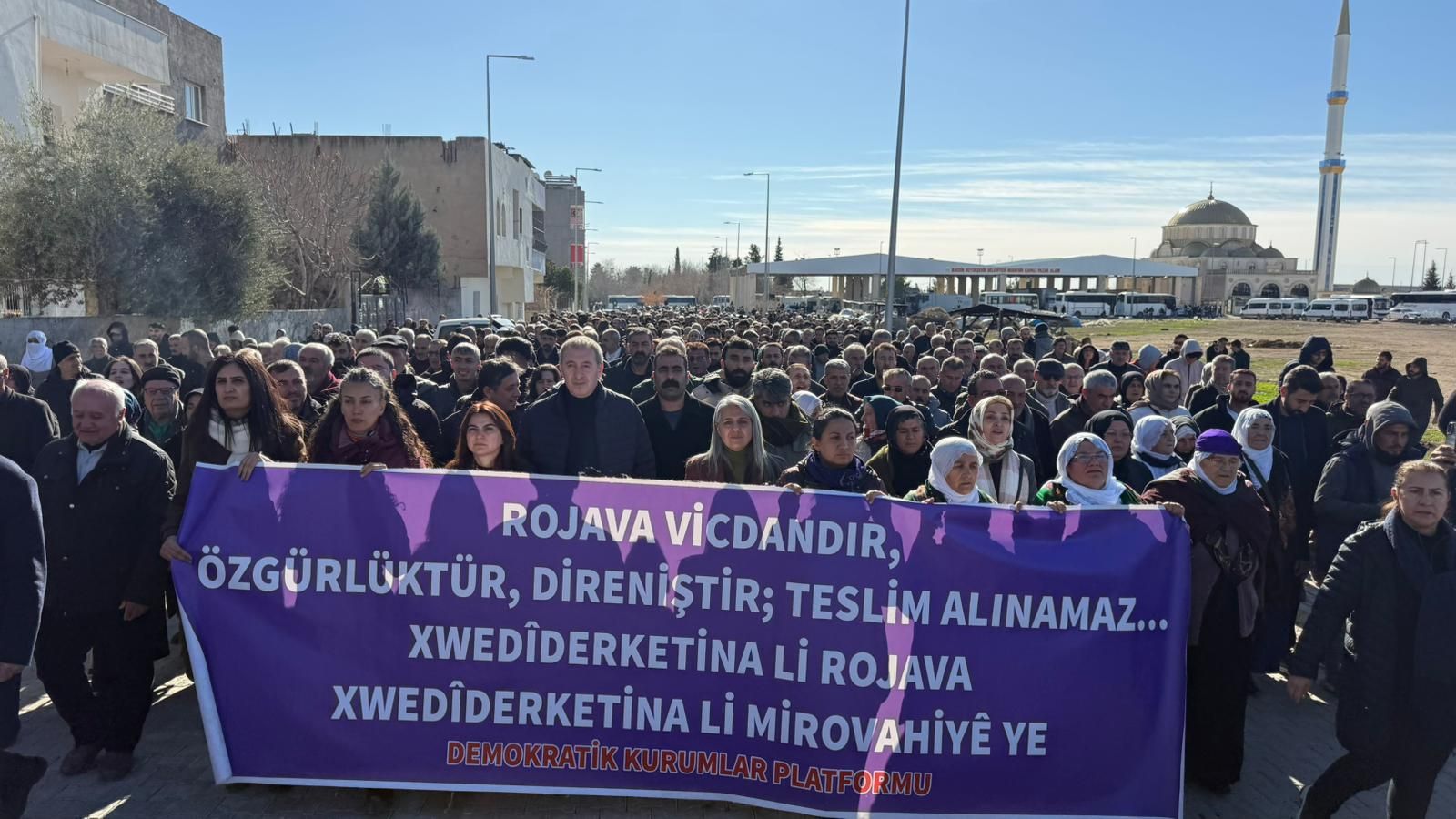 Di demekê de ku li navçeya Nisêbînê ya Mêrdînê nobedariya li dijî êrîşên li ser rojavayê Kurdistanê berdewam dike, serê sibê bi hezaran kes li ber goristana Hecace ya li ser sînorê Qamîşloyê kom bûn. Girseya ku di nav wan de Hevserokê Partiya Wekhevî û Demokrasiyê ya Gelan (DEM Partî) Tuncer Bakırhan û Hevseroka Partiya Herêmên Demokratîk (DBP) Çigdem Kiliçgun Uçar jî hebûn, bi qîrîna dirûşmeyên wekî "Rojava Rojhilat e, Kurdistan yek welat e", "Bijî berxwedana Rojava" û "Bijî berxwedana gelê Kurd" meşiyan. Di tevahiya meşê de, girseyê gelek caran stranên hevgirtinê bi gelê Rojava re digotin û meş di kolanên Nisêbînê de berdewam kir û gihîşt Kolana Midyatê.