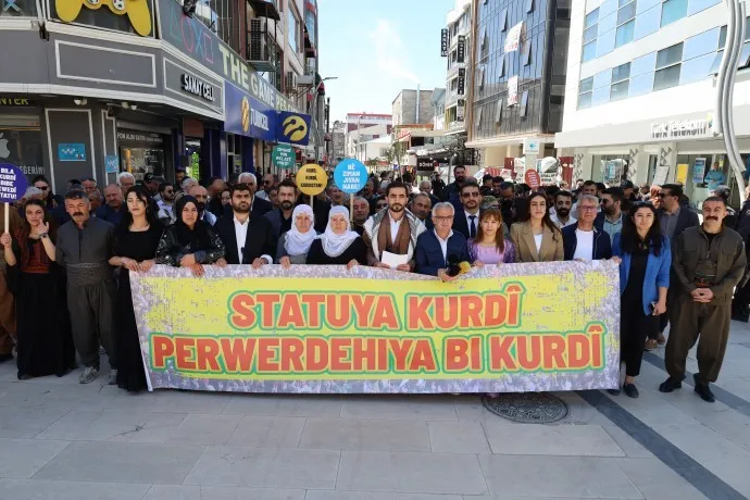 Nûnerên rêxistinên civaka sivîl, rêxistinên pîşeyî û partiyên siyasî, têkildarî 15ê Gulanê Cejna Zimanê Kurdî daxuyanî dan. Daxuyanî, li Kolana Hunerê hate dayin û pankarta “Statuya Kurdî, perwerdehiya bi Kurdî” hate hilgirtin.