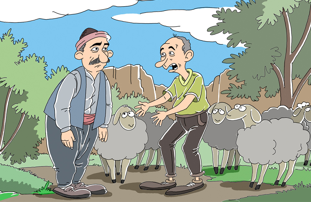 Çû lê nêrî ku cîranê wî li ber kerî sekiniye, şivek di dest de pez bêr dike.