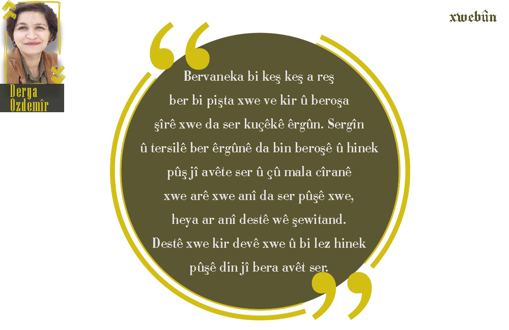 Xeftanê carsoyî hêşin ê gulgir li Rihîmeyê bû; bejna wê tev de rabûyî xeftanê lê ji eslê cawê wê xweşiktir xuya dibû. Şemsê di ber xwe de digot: “Xeftan û kumê wê çi qas lê tê. Nava Rihîmeya min tenik û zirav e, gustilkê ji jor berde wê li jêr bisekine. Di gund de bûka herî xweşik a min e. Rihîmeya min bûye deqa jinan lê hîn zarî ye. Hinekî bielimiya kar jî bes bû. Şemsê dixwest karê wê jî wekî çelengiya wê bi navûdeng be û bibe kebanîyeke jêhatî.
