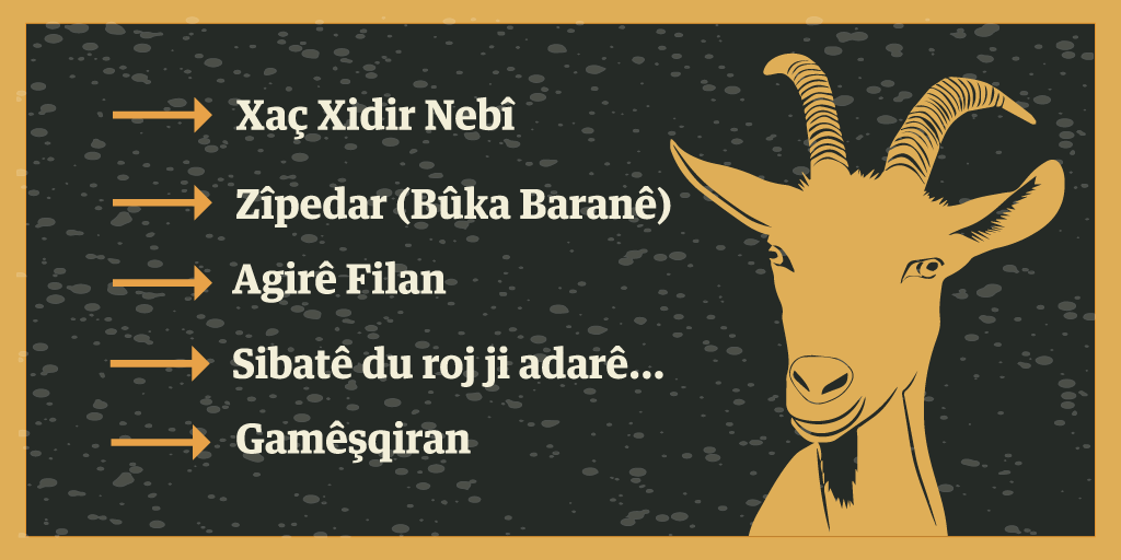 Debara gundiyan bêhtir li ser xwedîkirina heywanan bûye. Ji ber ku zivistanê pir dirêj kişandiye, qût û qelatên heywanan, beriya biharê qedyane û derketina heya biharê pir dijwar bûye. Ji ber vê yekê, wan rojên zivistanê jimartine. Li gor wan, zivistan ji kanûnê destpê dike, heya meha çileya paşîn pir bi sar û seqem derbas dibe. Piştî çileyê, îcar hêdî hêdî dinya germ dibe lê gelek caran bi germa hewayê xapiyane û wan heywanên xwe birine zozanan. Lê ji nişka ve, ba û bahoz derketiye û heywanên wan telef bûne û wan jî ji ber vê navek li her bûyerê kiriye û heta roja îro ew nav mane. Wek ‘Xaç Xidir Nebî’, ‘Zîpedar’, ‘Agirê Filan’, ‘Sibatê du roj ji adarê deyn kir, gîsk li tehtê wer kir’, ‘Gamêşqiran’…