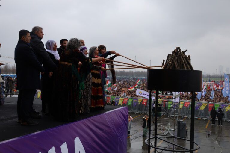 Li Stenbolê agirê Newrozê ji aliyê Dayikên Aştiyê, Hevseroka Giştî ya DEM Partiyê Tulay Hatîmogullari, Çetîn Arkaş, aktivîstên TJA Gulten Kişanak û Sebahat Tuncel û Hevberdevka HDKê Meral Daniş Beştaş ve hat pêxistin.