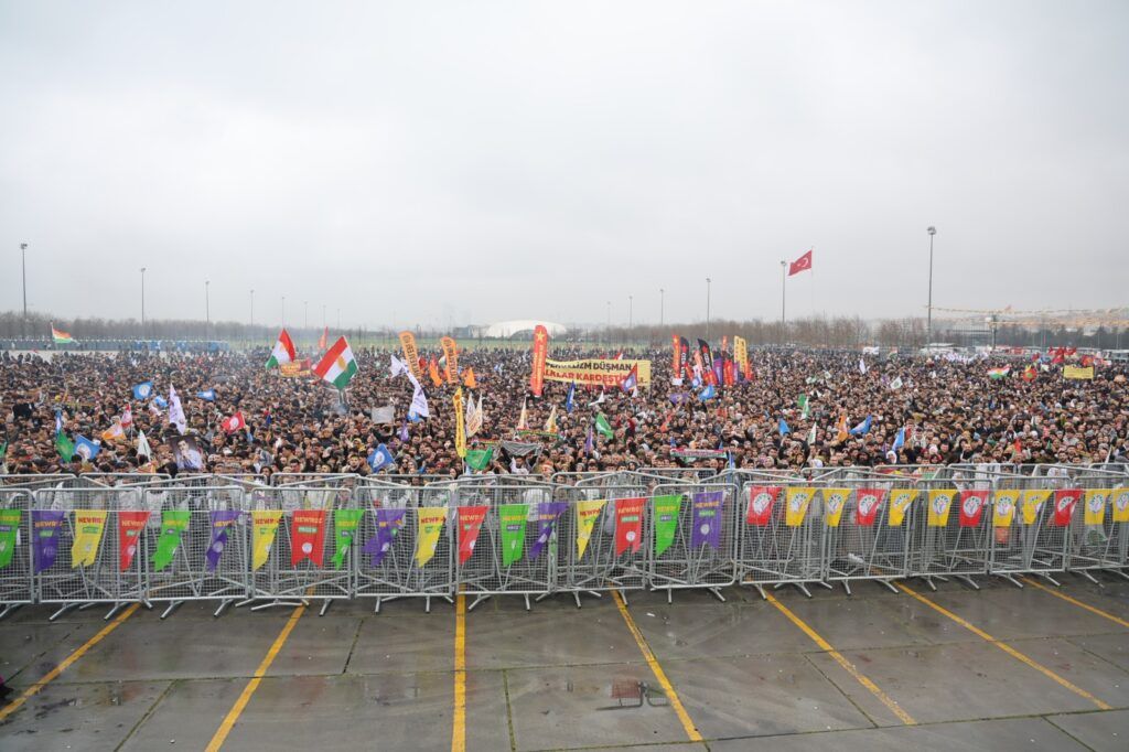 Girseya li qada Newrozê bê navber dirûşmeyên, ‘Bijî Serok Apo’, ‘Bê Serok jiyan nabe’, ‘Jin jiyan azadi’ û ‘Yek e yek e yek e Kurdistan yek e’ berz kir. Piştre jî komîteya amadekar li ser dikê girseyê silav kir. Hevserokên DEM Partiya Stenbolê Arîfe Çinar û Çinar Altan jî girse silav û axaftineke kurt kirin.