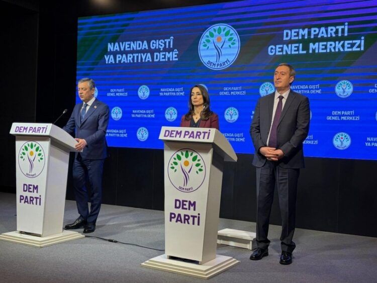 Hevserokên Giştî yên DEM Partiyê Tulay Hatimogulları û Tuncer Bakirhan ligel Serokê Giştî yê CHPê Ozgur Ozel, piştî hevdîtinê civîneke çapemeniyê ya hevpar li dar xistin.